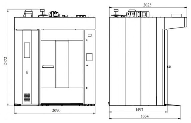 Верхний привод вращения стеллажной тележки, низкий порог пекарной камеры, короткий пандус, верхний узел фиксации тележки позволяют избежать встряски тестовых заготовок при закатывании стеллажной тележки, исключают ее смещение во время выпечки